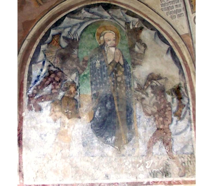 Sulle pareti gli affreschi superstiti raffigurano i devoti sotto il manto della Vergine, a destra; san Sebastiano affiancato da san Rocco sulla parete di fondo: a sinistra, le tentazioni di sant’Antonio abate o meglio le torture che subisce da parte dei diavoli.